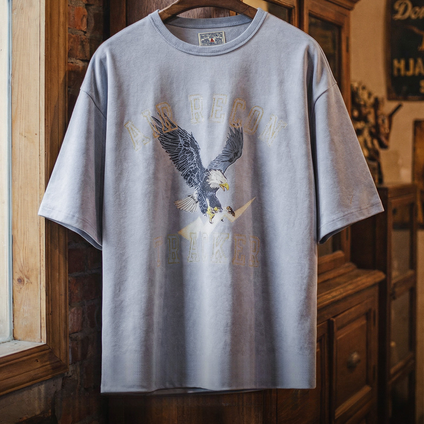 American Printed Gray Round Neck Loose Shoulder Long Sleeved T-Shirt