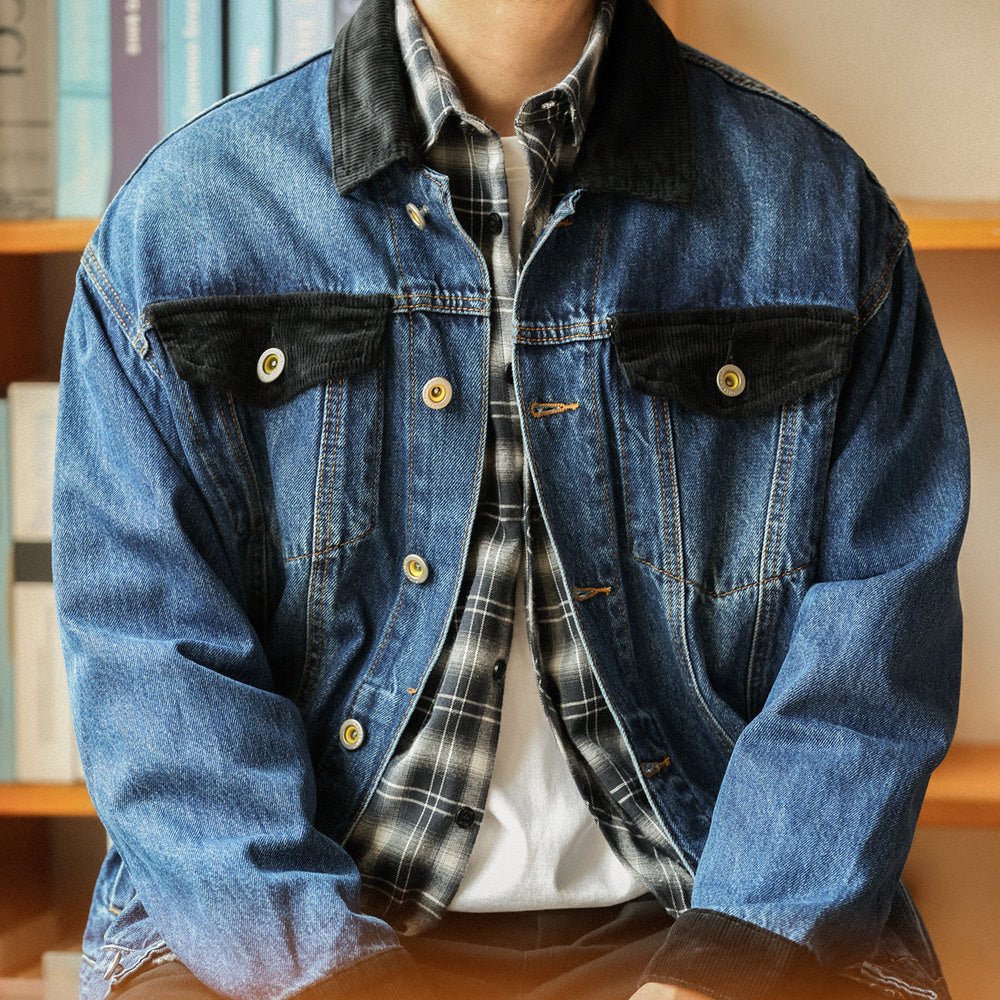 Stone washed denim jacket with loose corduroy patchwork collar, casual vintage jacket