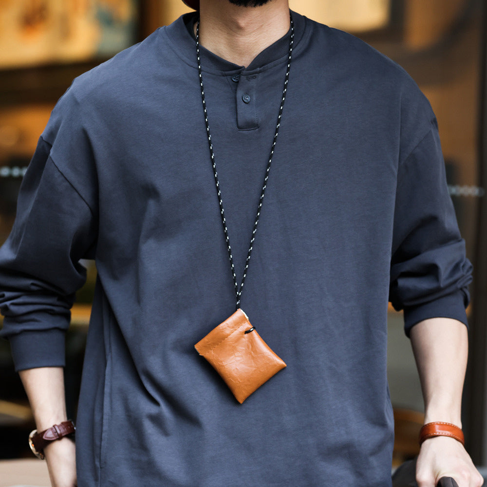Henry collar long sleeved T-shirt loose casual 280g pure cotton side pocket dark gray base shirt