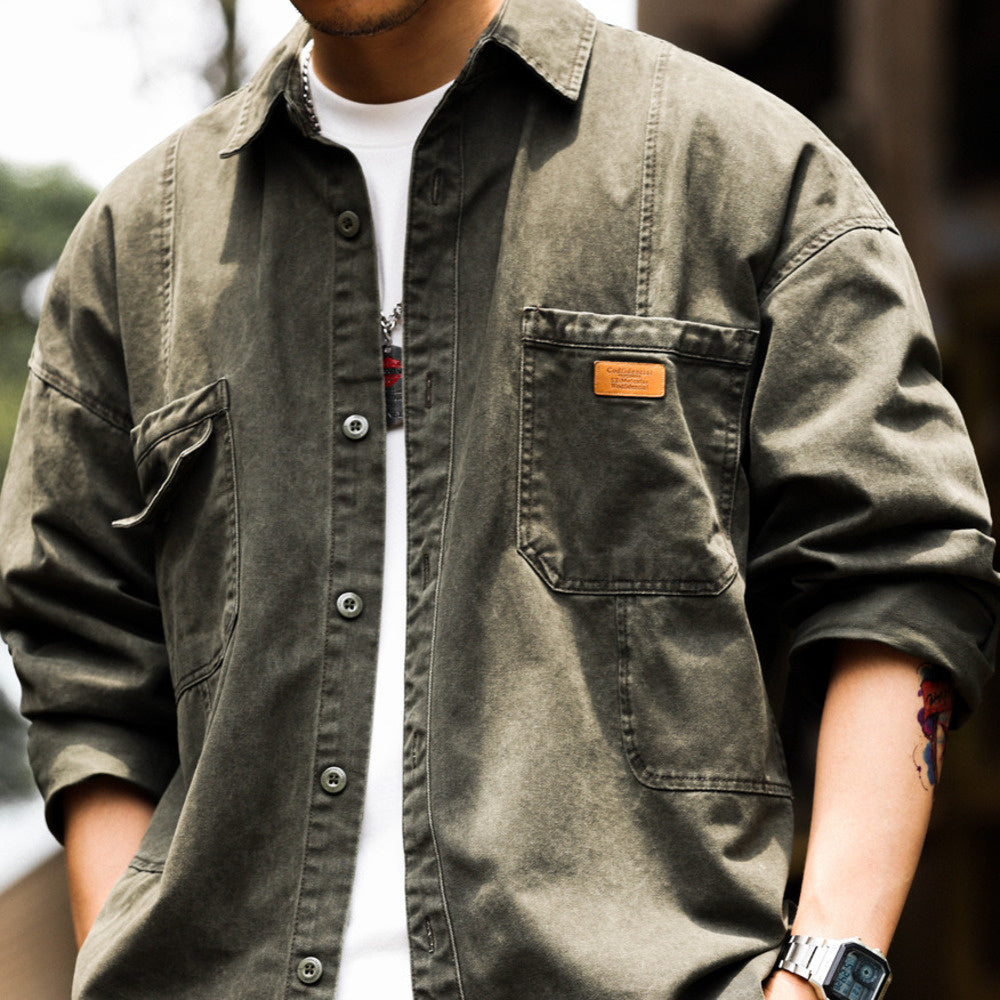 Wash off workwear shirt, military green tough guy hunting outfit, loose jacket