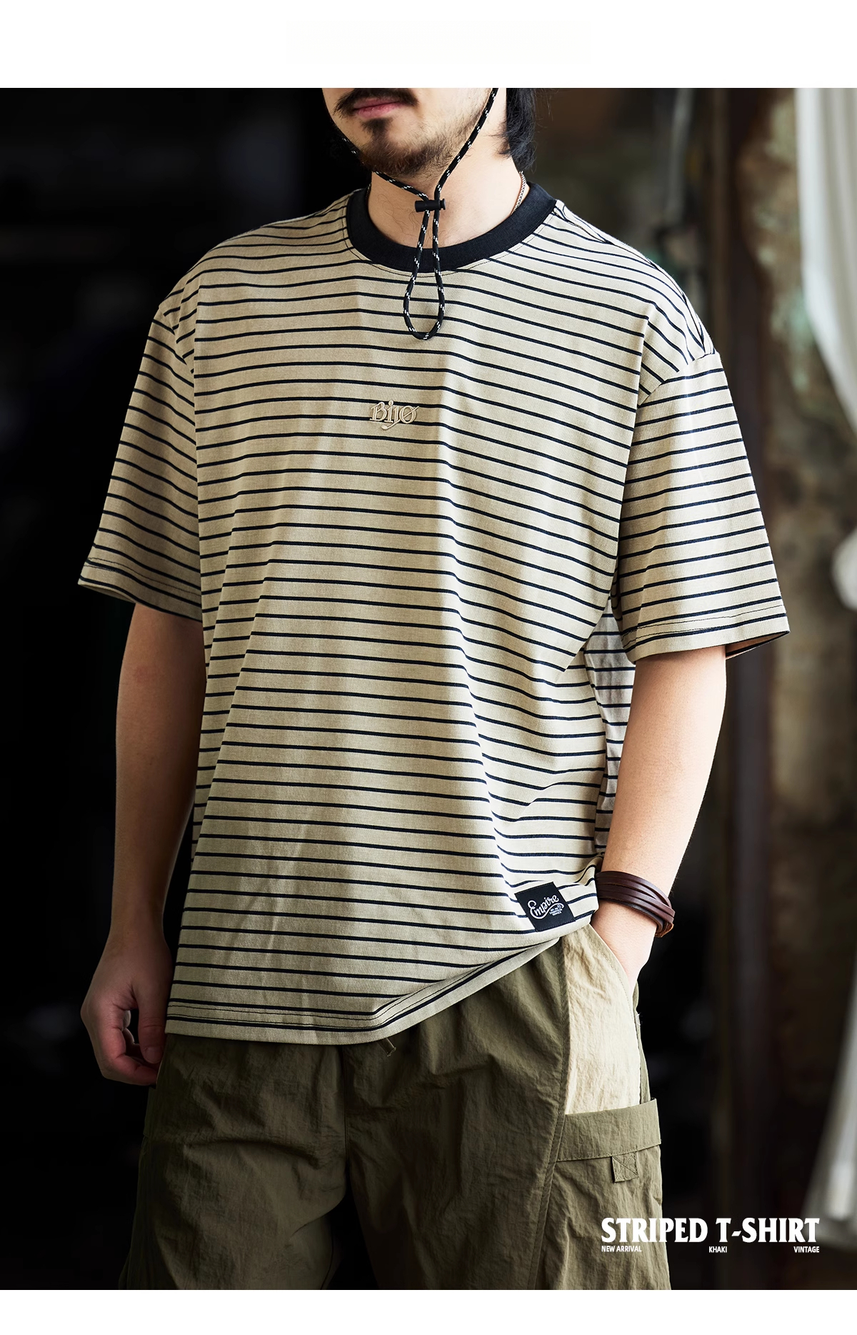 American classic retro striped embroidered men's loose T-shirt