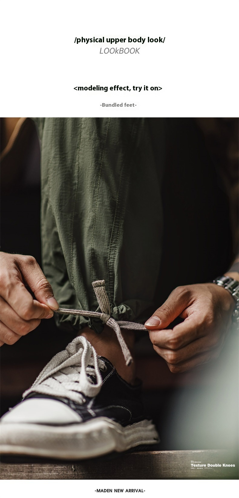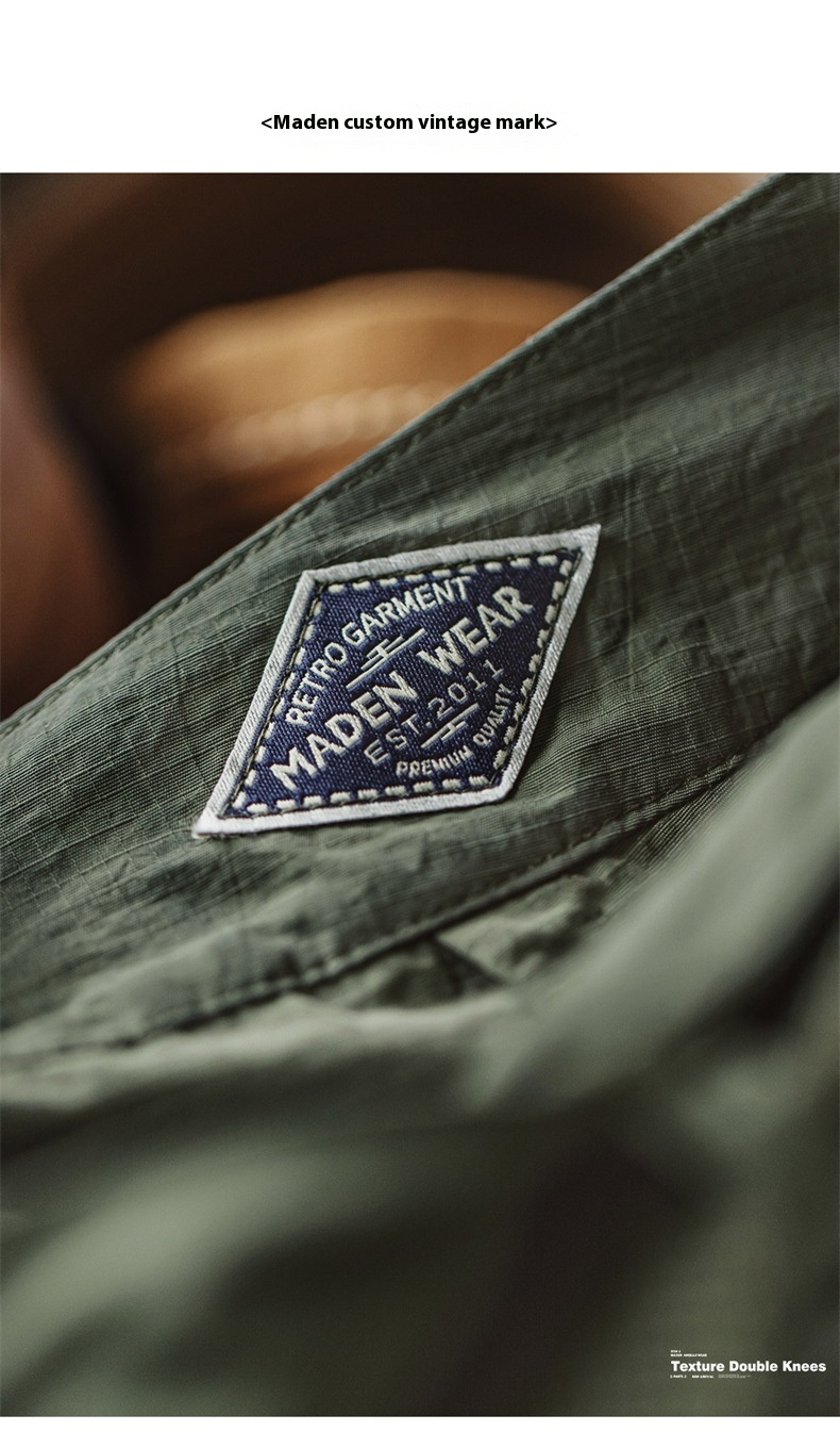 Maden Retro Quilted Fold Double Knee Pants Thin Drawstring Leg Straw Army Green Straight Casual Pants