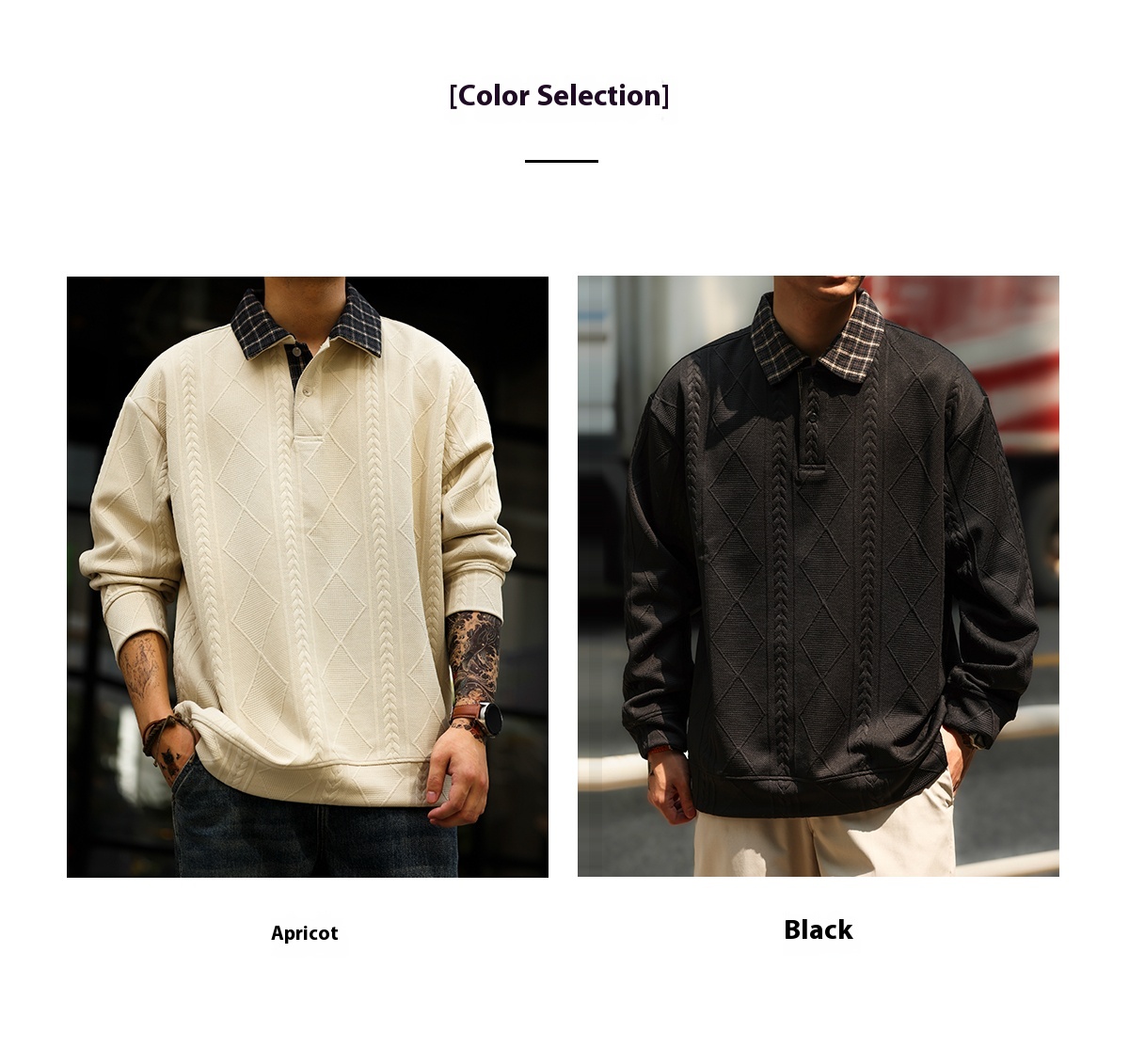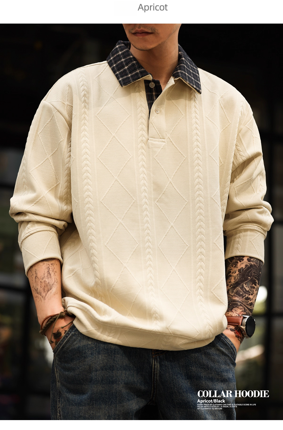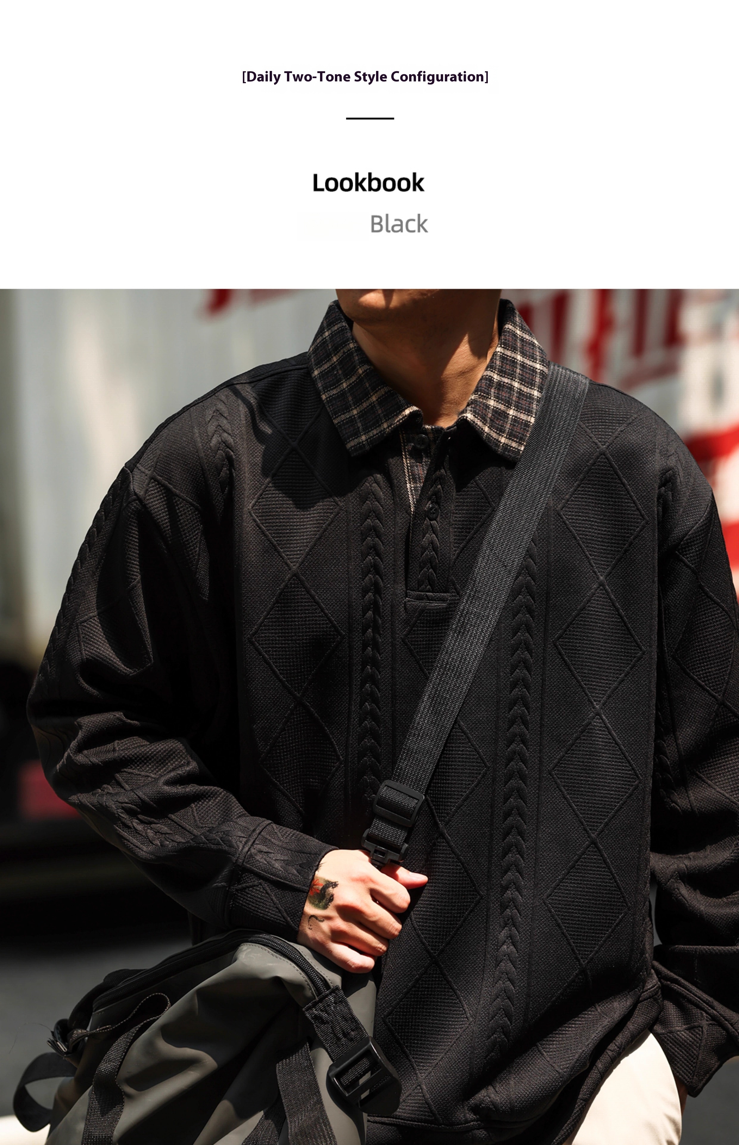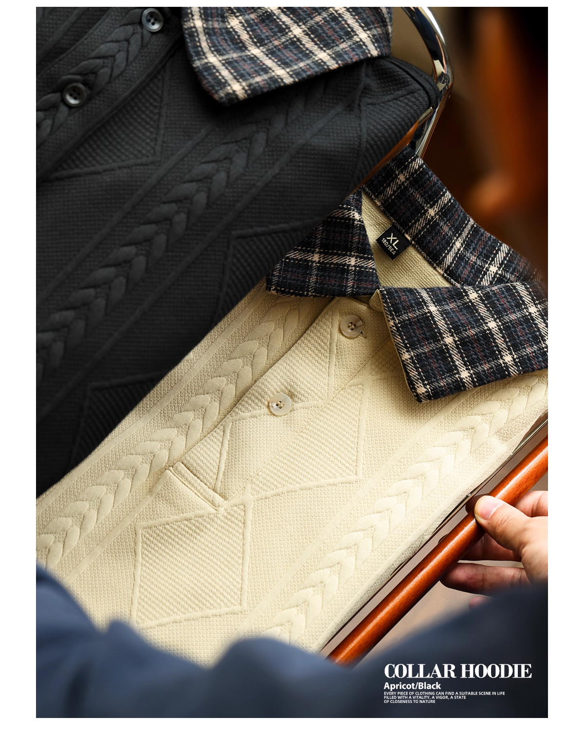 American Casual Knitted Texture Men'S Contrasting Plaid Lapel Long Sleeved Polo Shirt