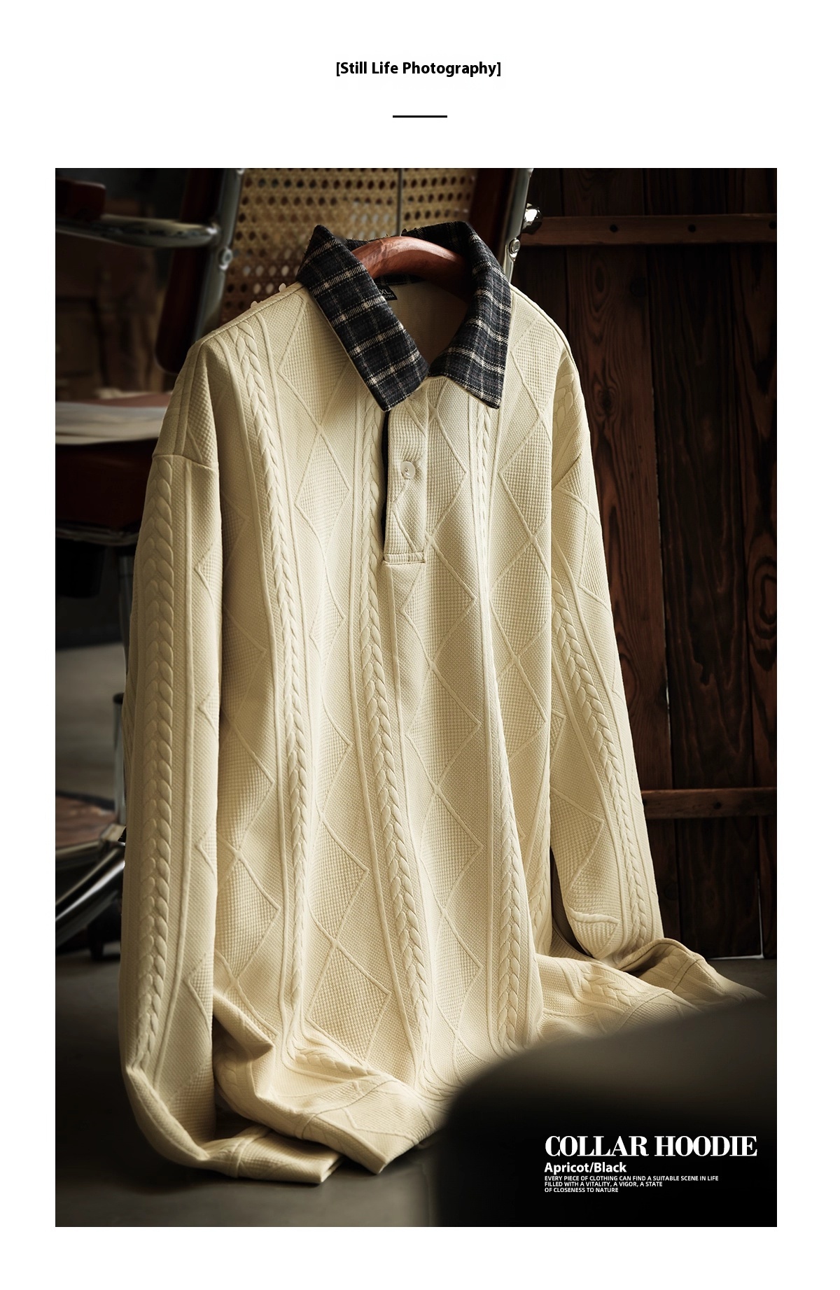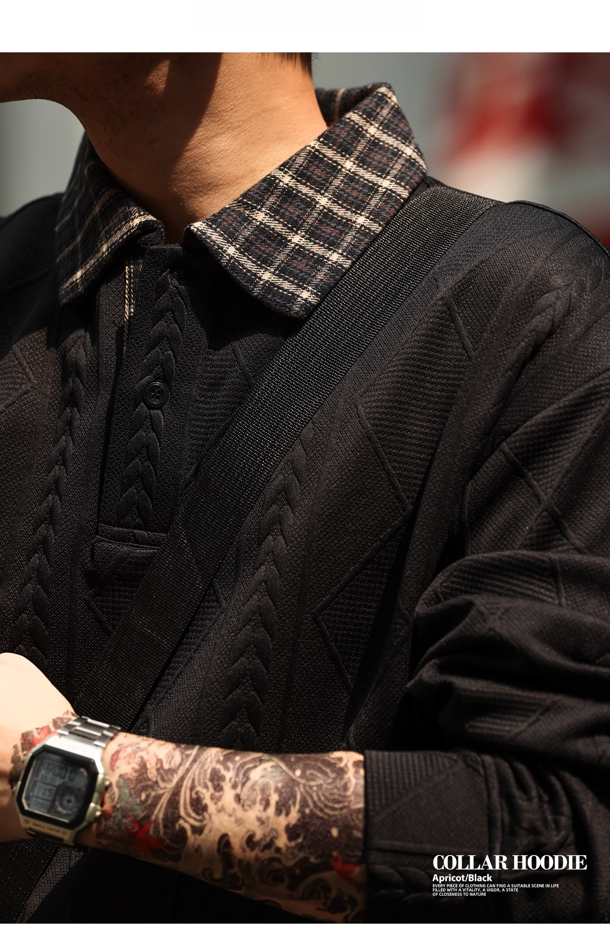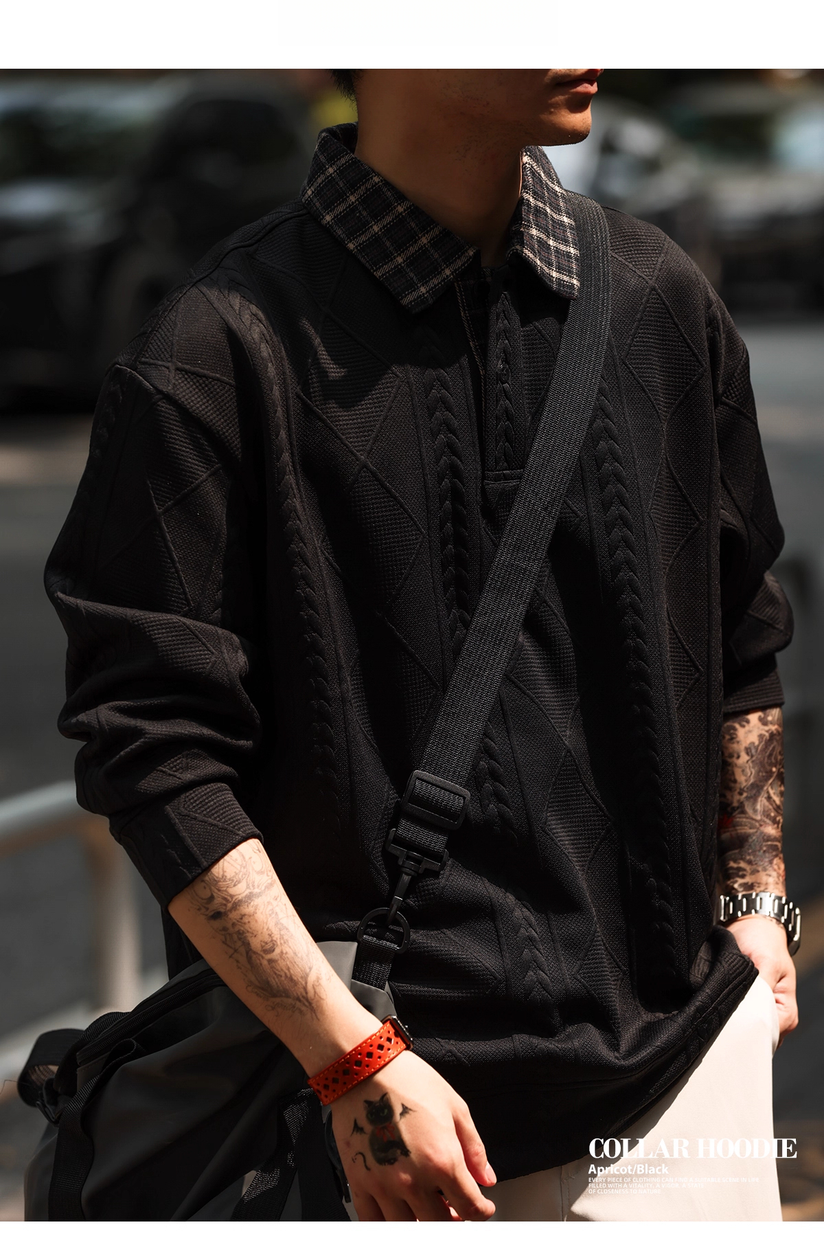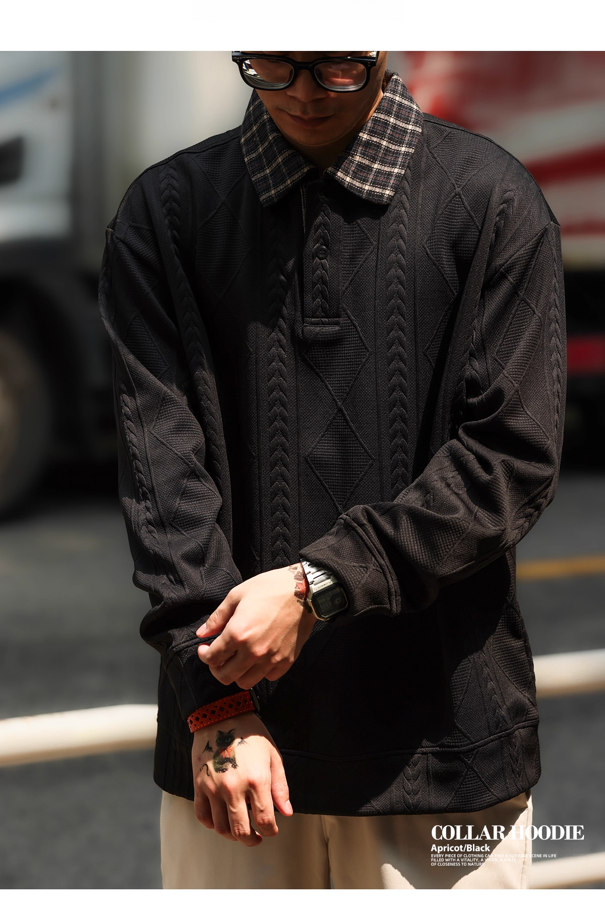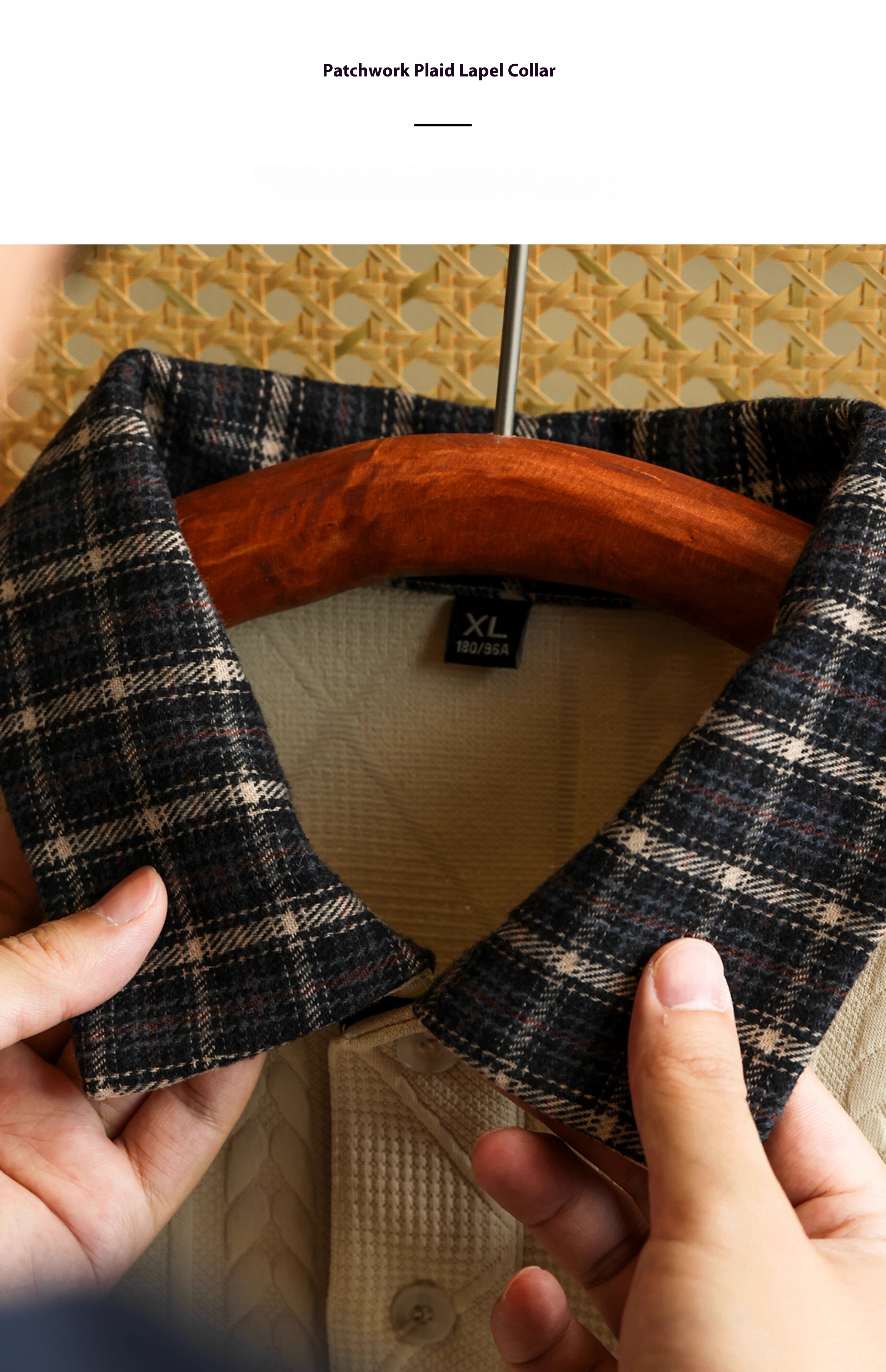 American Casual Knitted Texture Men'S Contrasting Plaid Lapel Long Sleeved Polo Shirt
