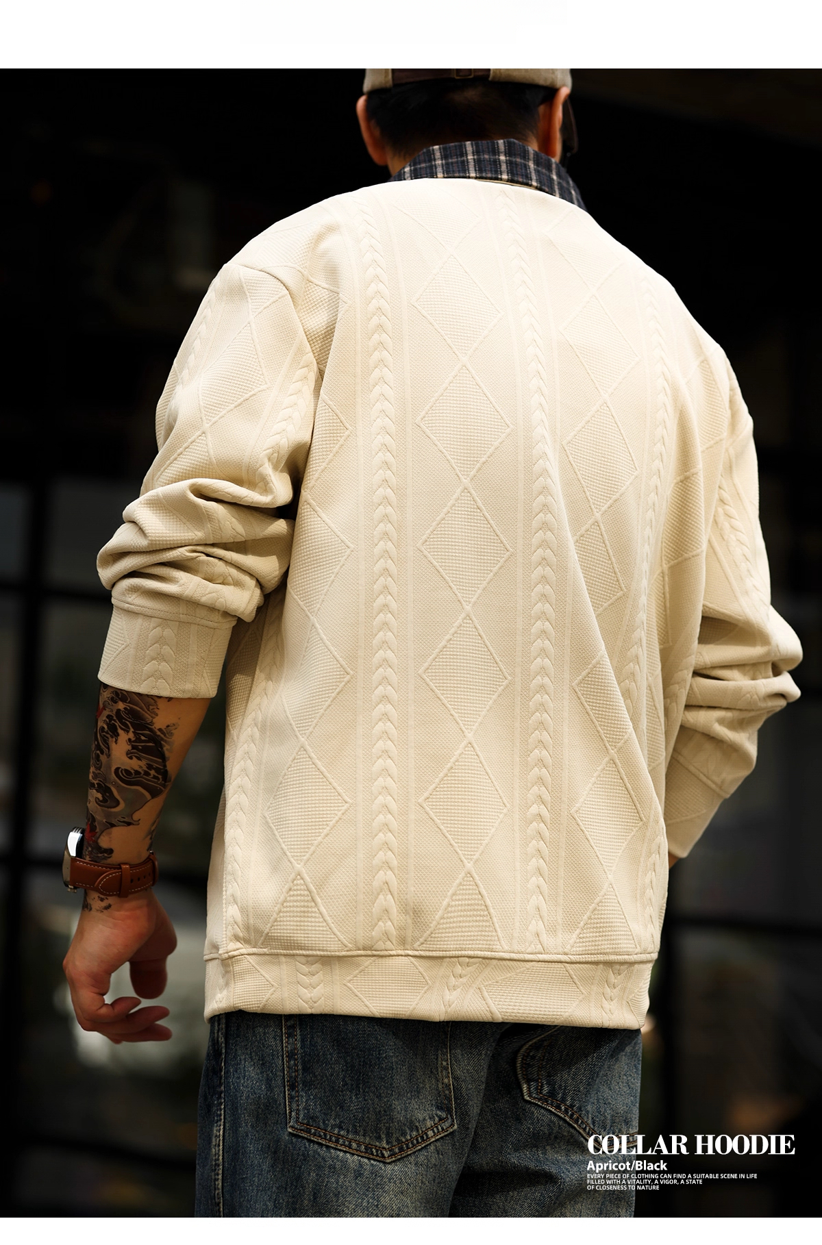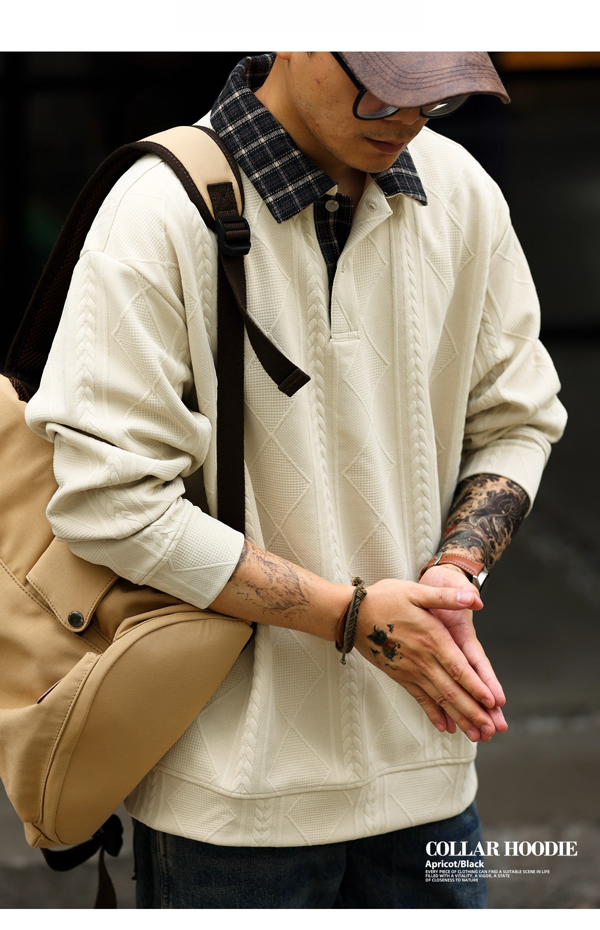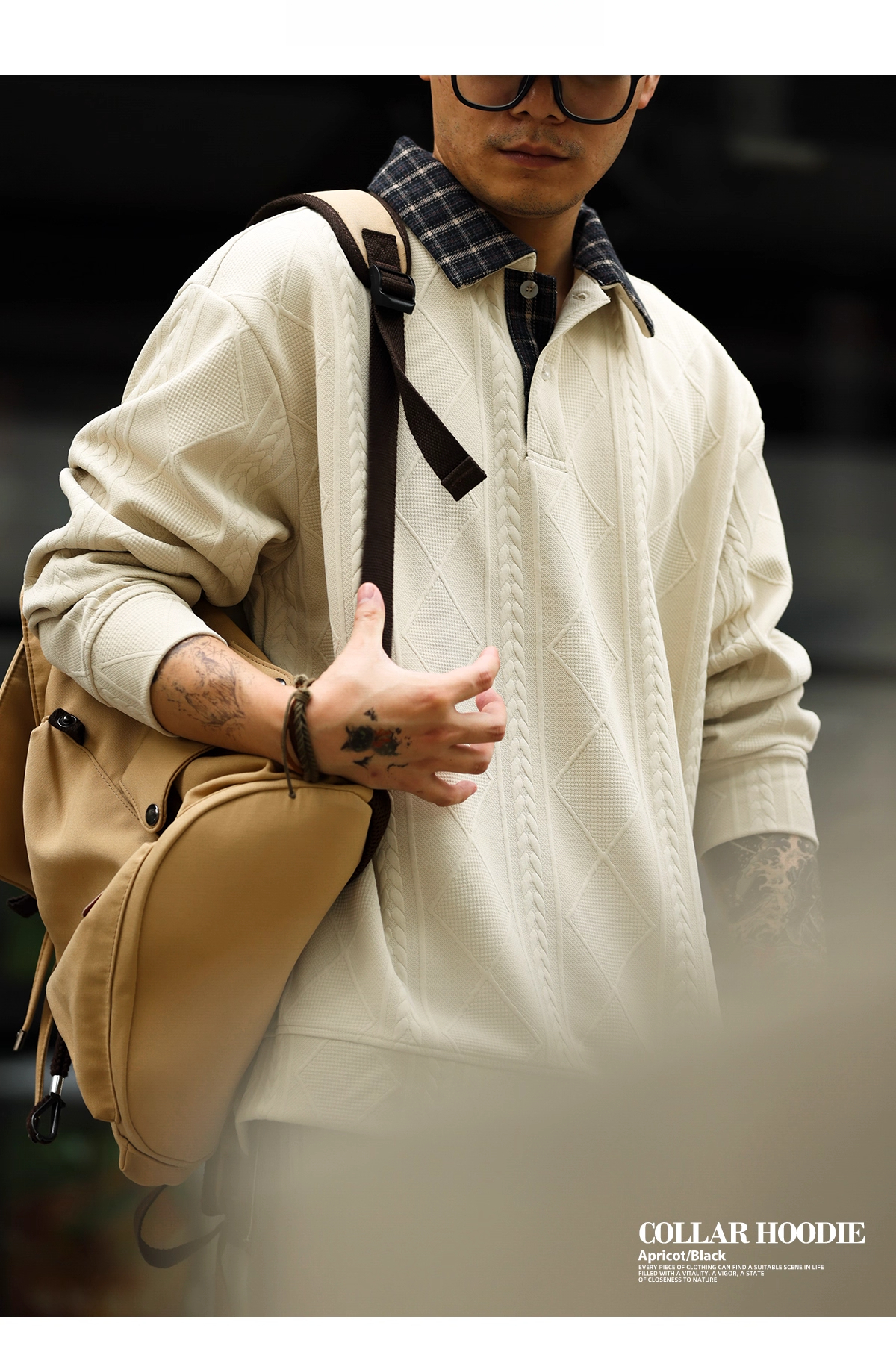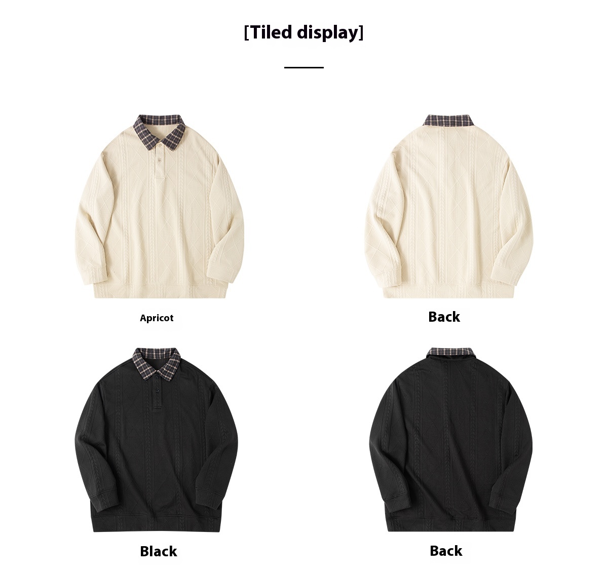 American Casual Knitted Texture Men'S Contrasting Plaid Lapel Long Sleeved Polo Shirt