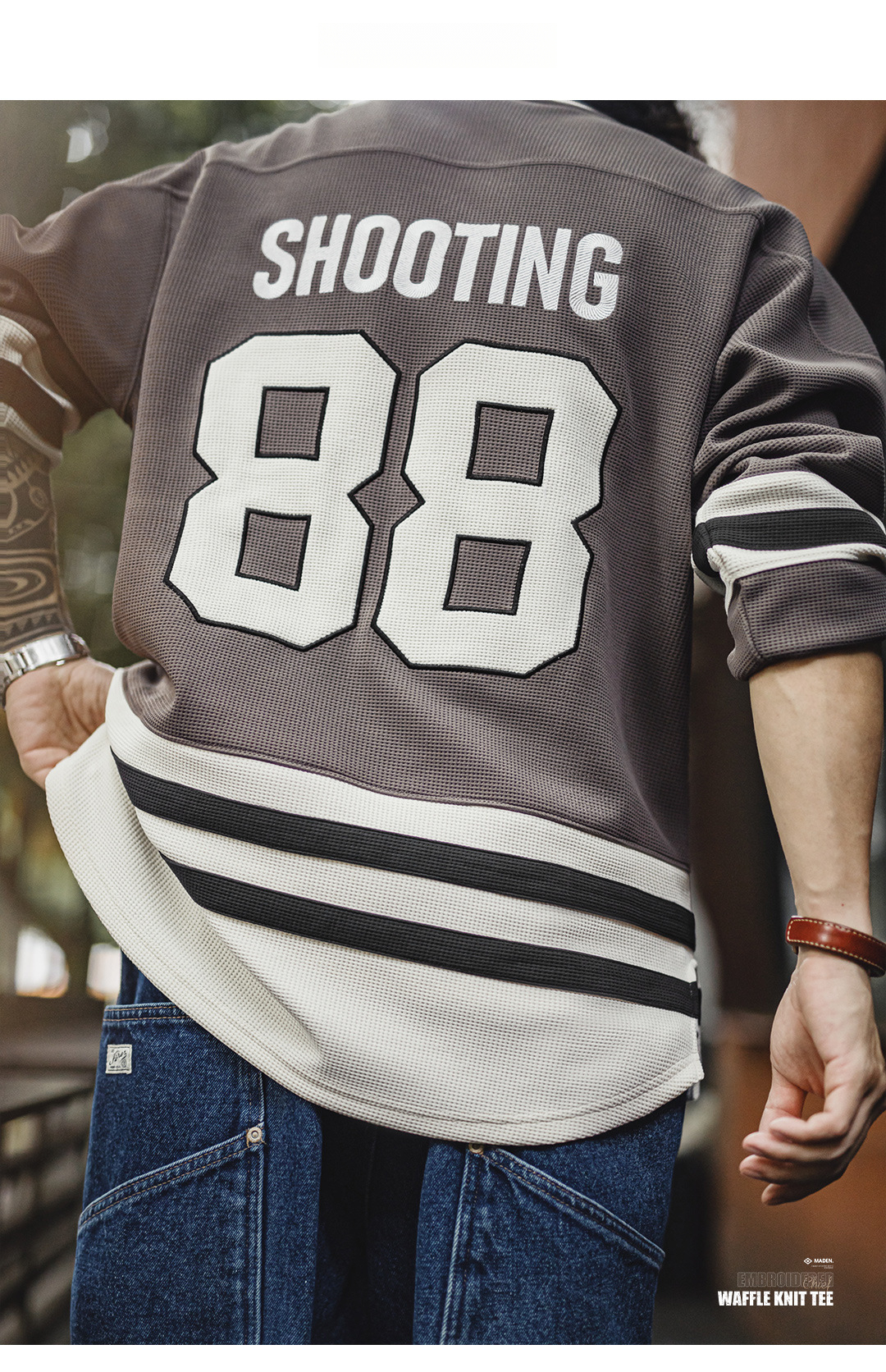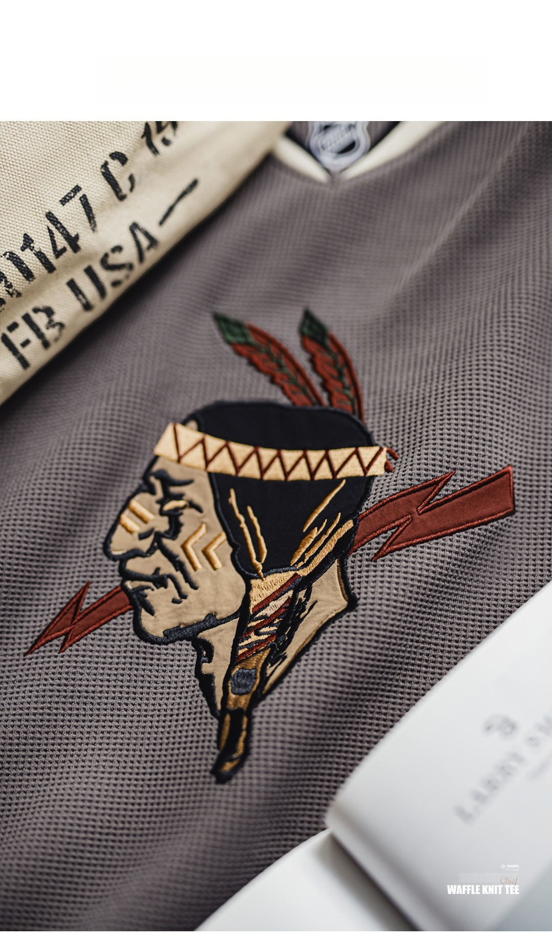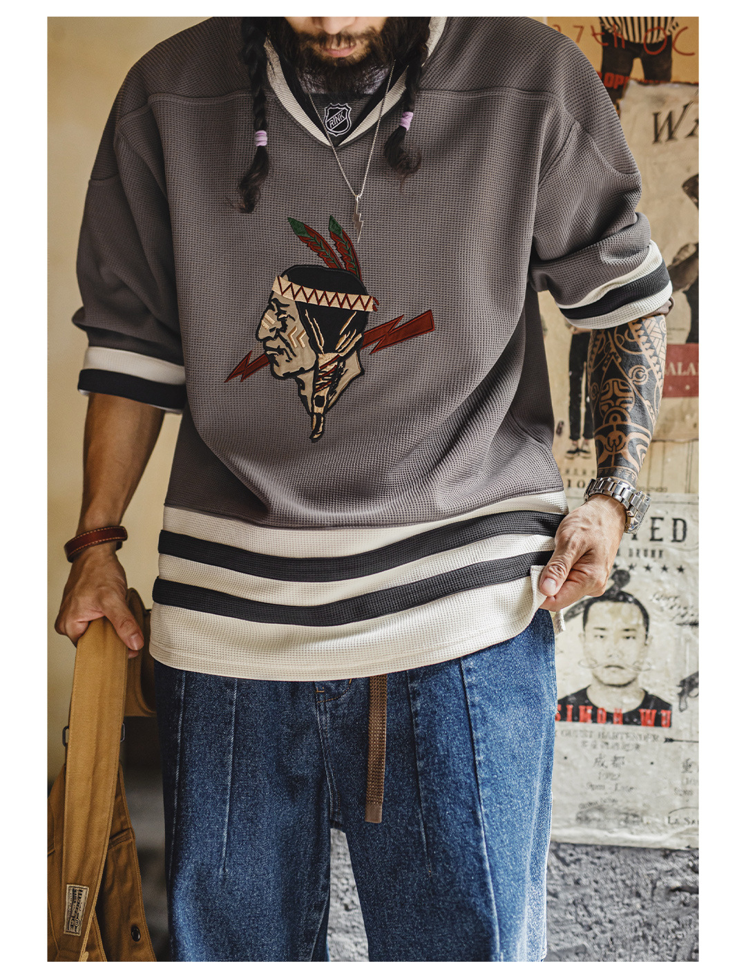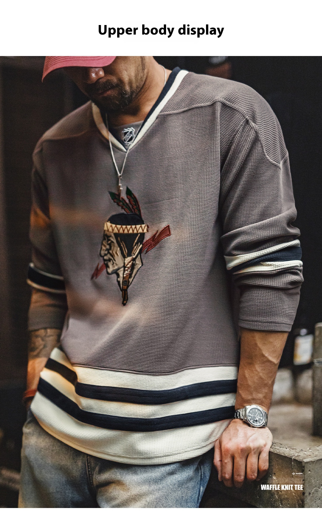 American Retro Indian V-neck Waffle Embroidered Knitted Long Sleeve T-shirt