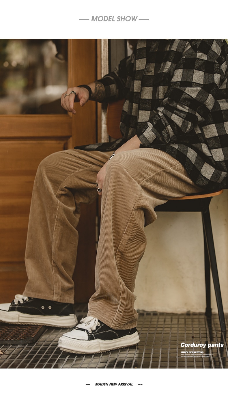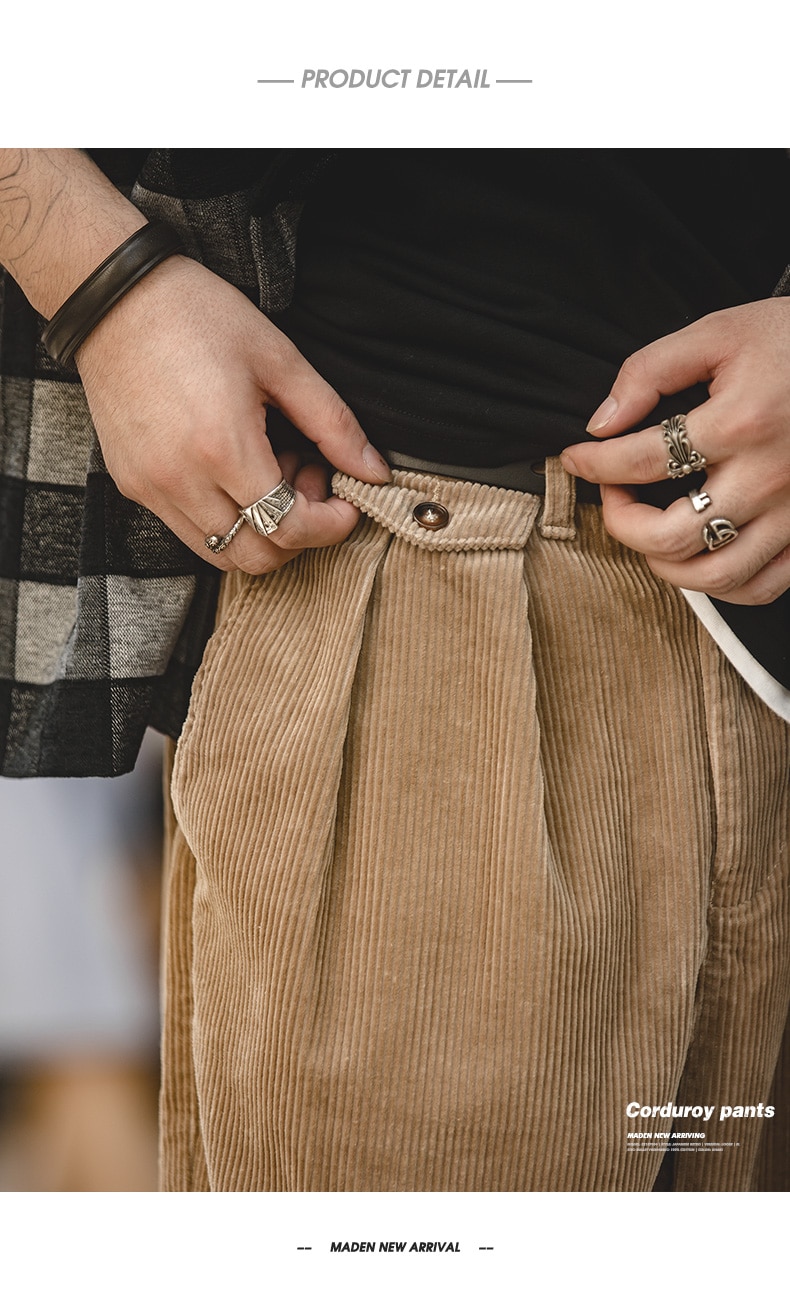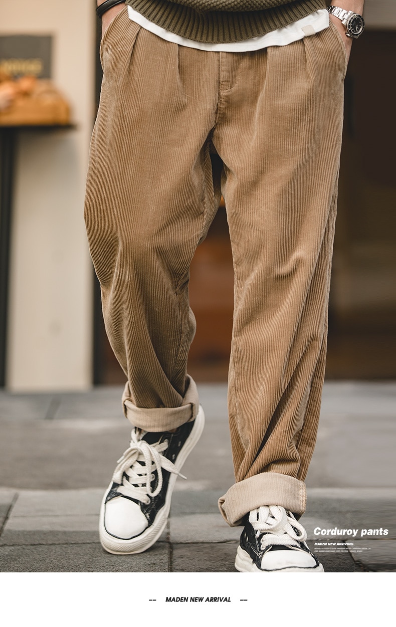 Maden Japanese Retro Loose Corduroy Pants Wide Leg Mid Waist Striped Velvet Straight Trousers Men's Winter Casual  Cargo Pants