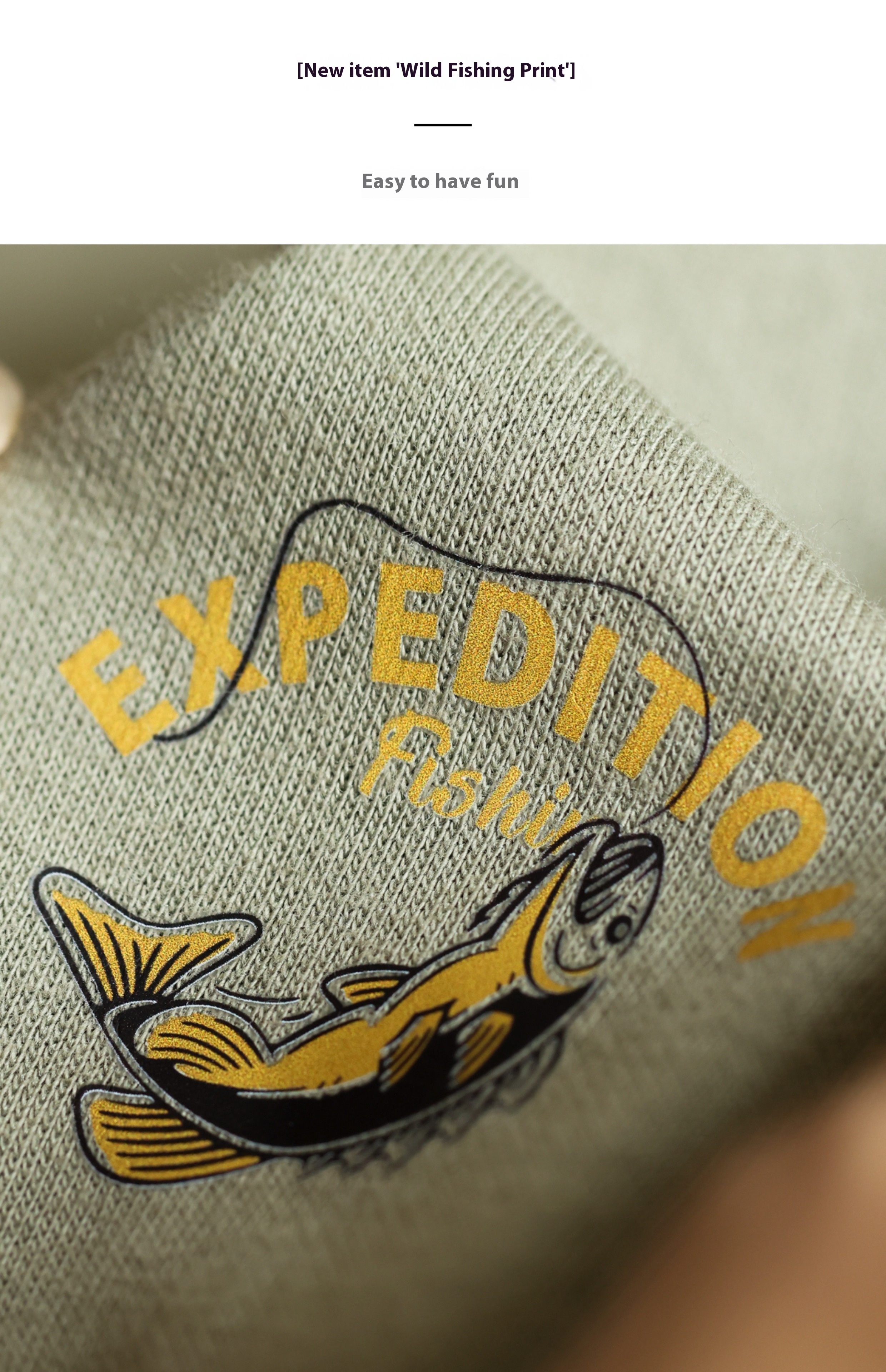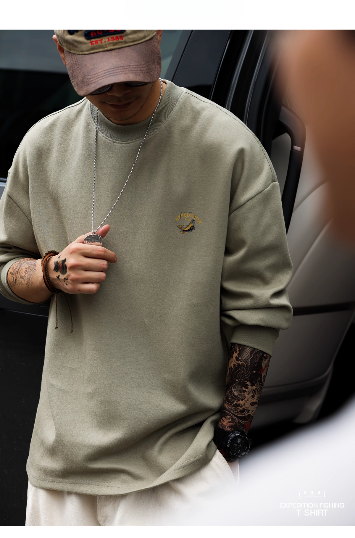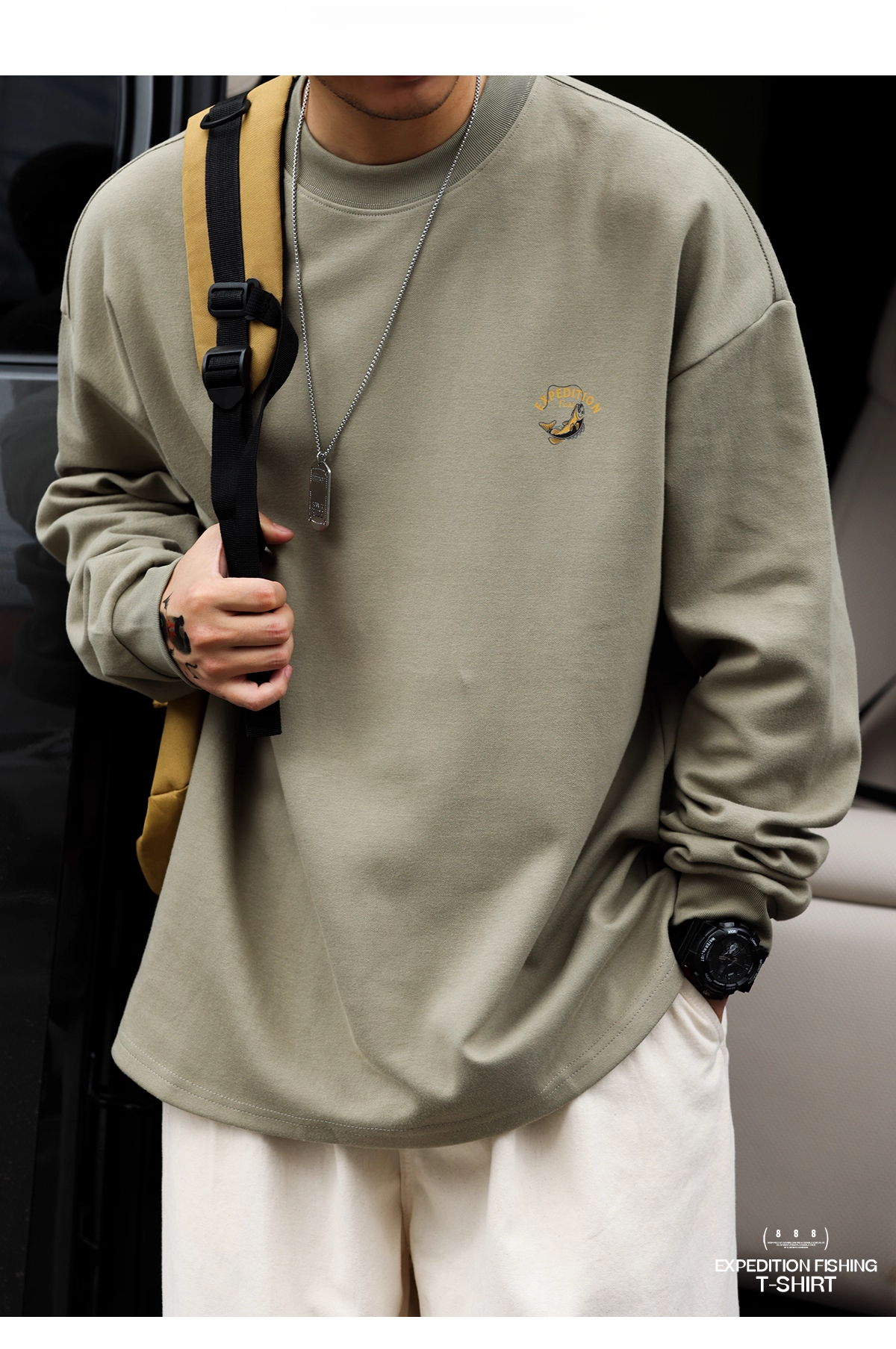 American Retro 300g Cotton Men's Small Collar Fishing Print Gray Green Long Sleeved T-Shirt