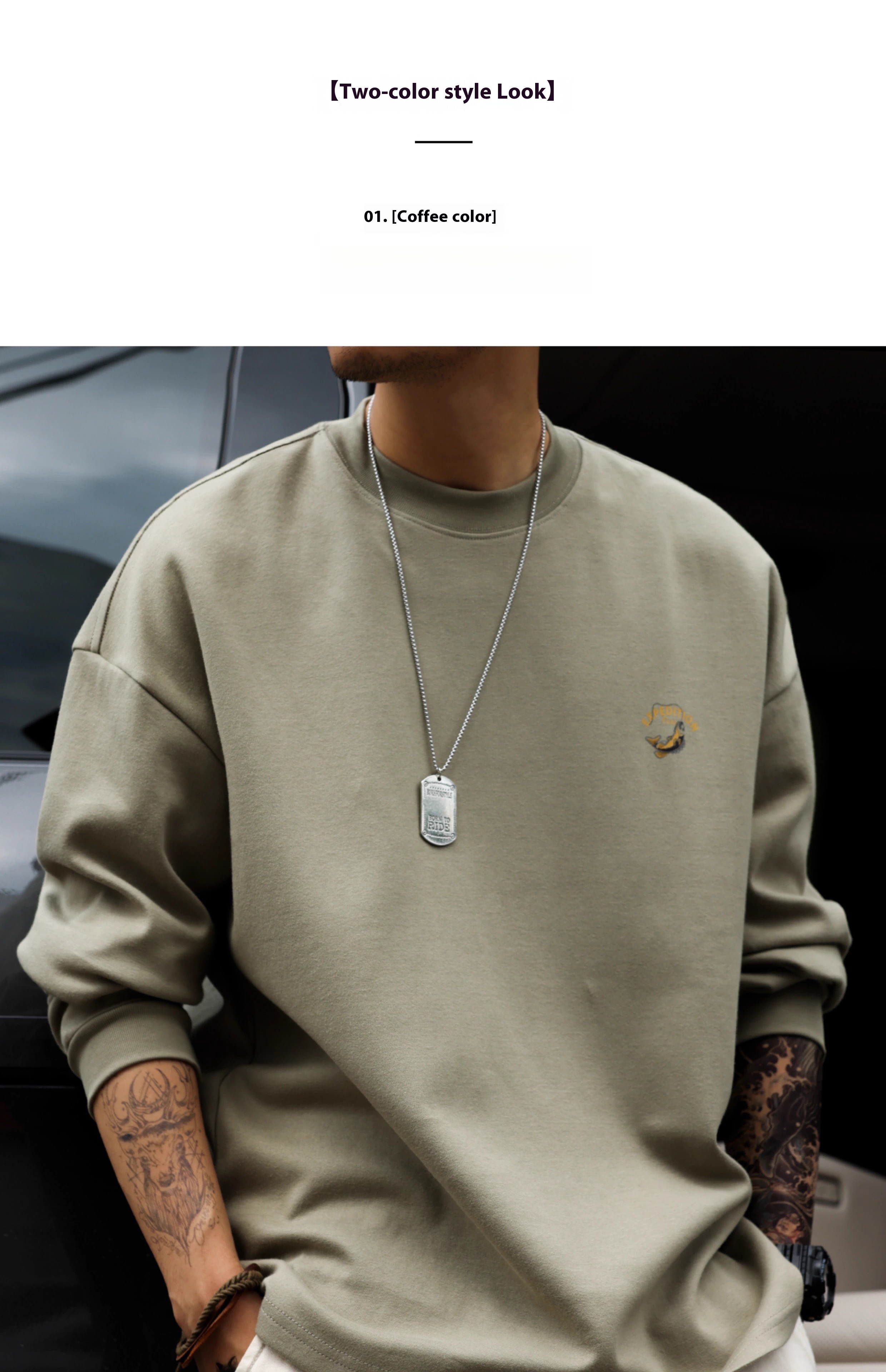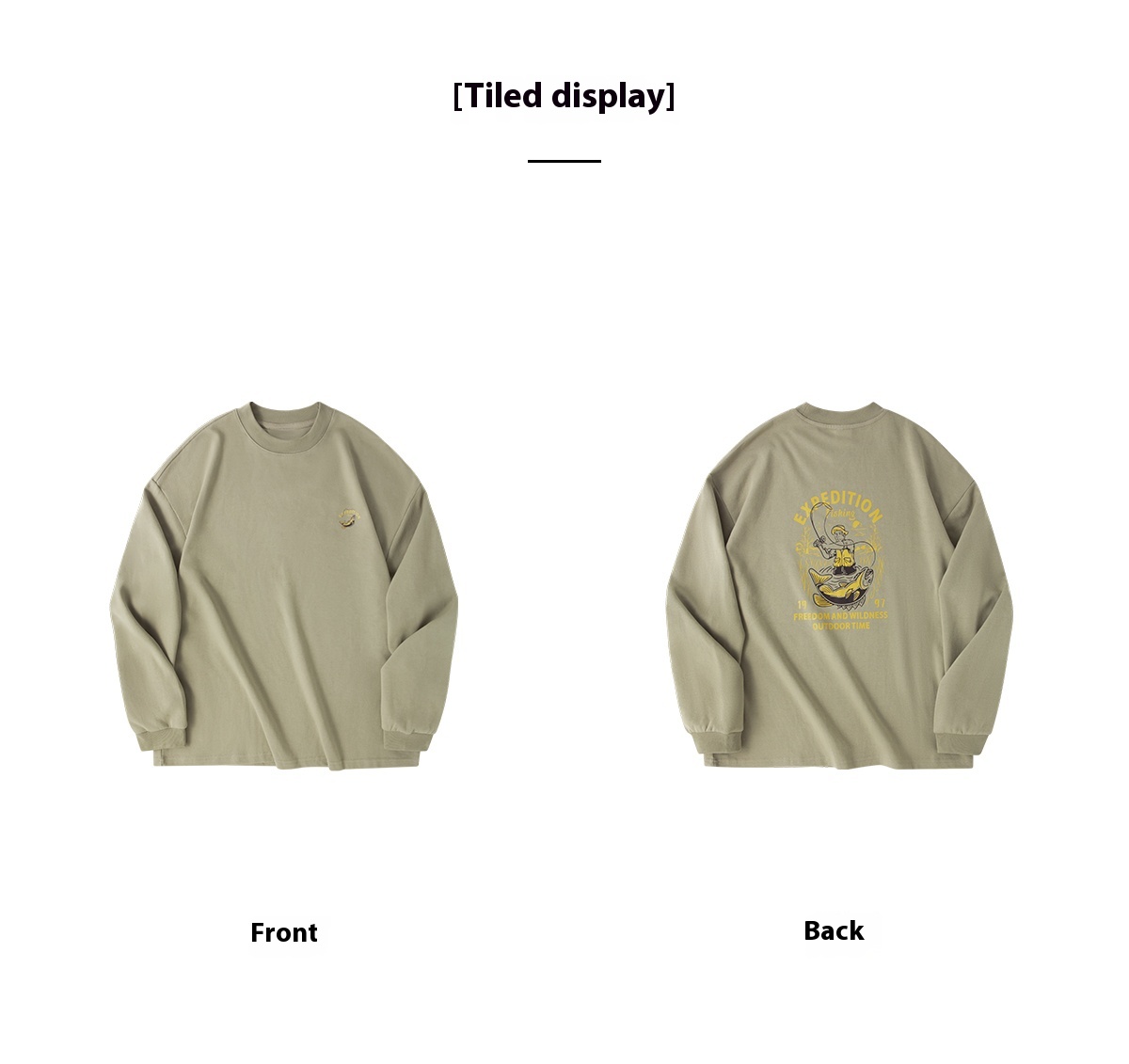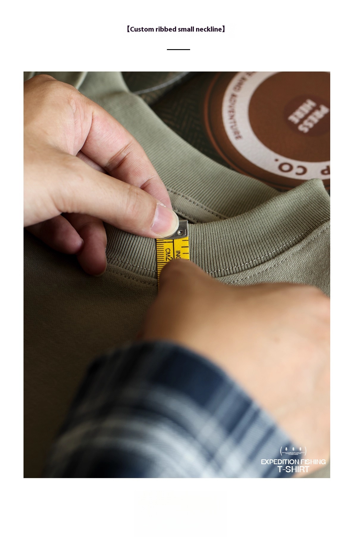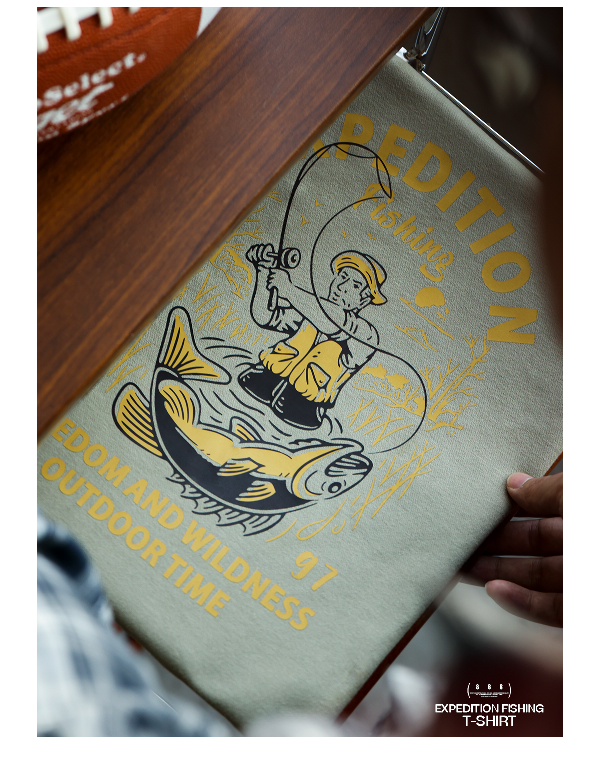 American Retro 300g Cotton Men's Small Collar Fishing Print Gray Green Long Sleeved T-Shirt