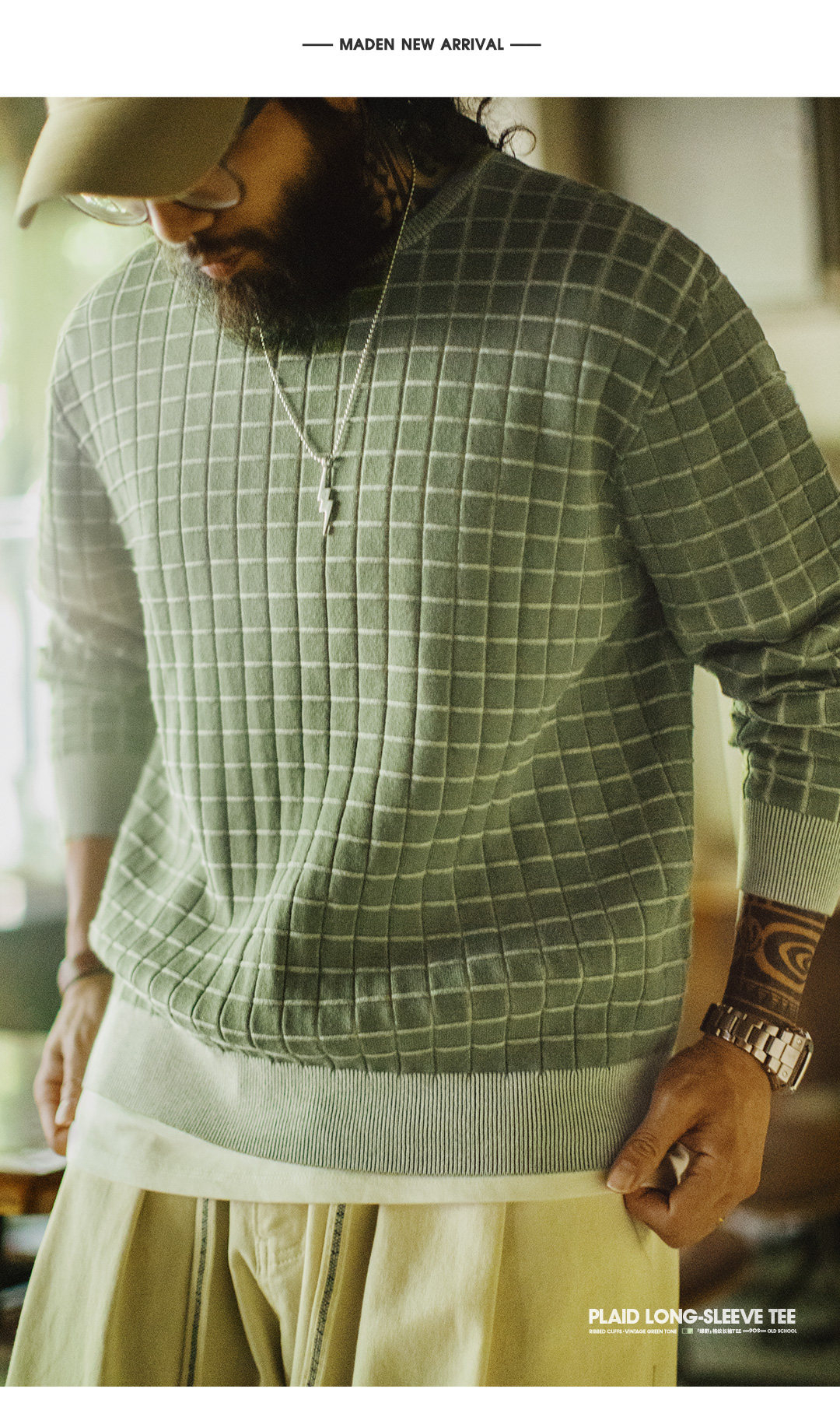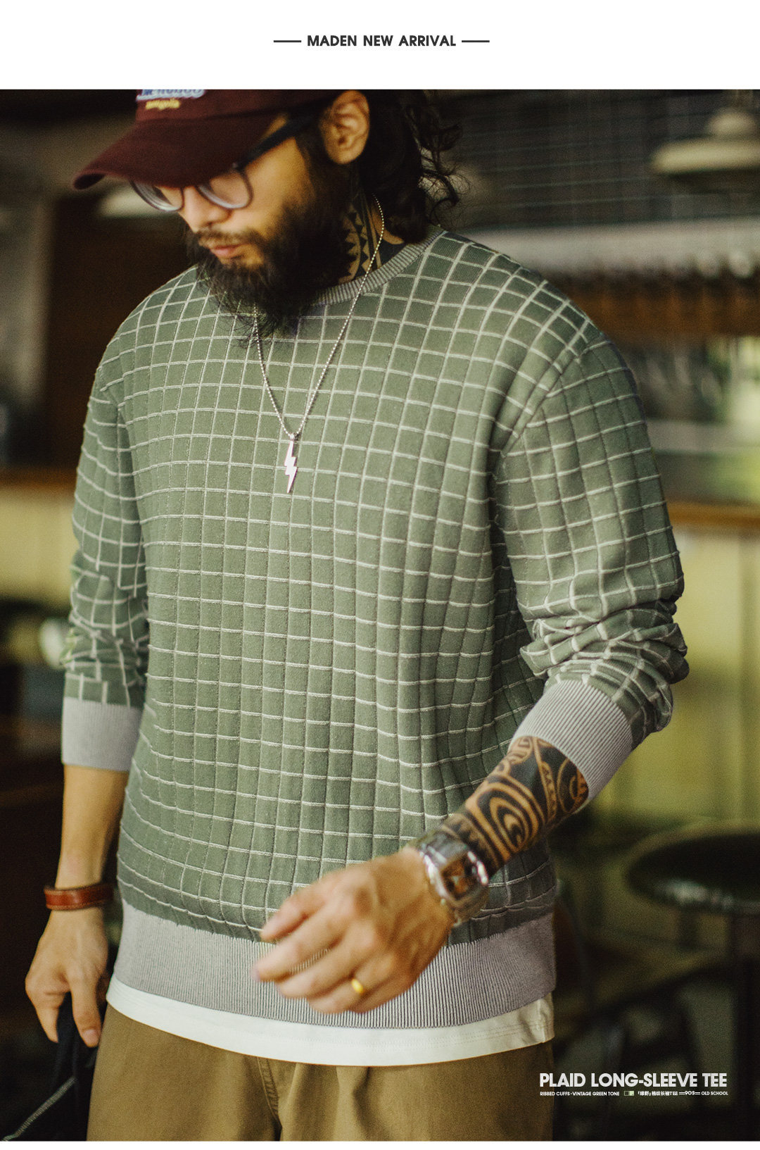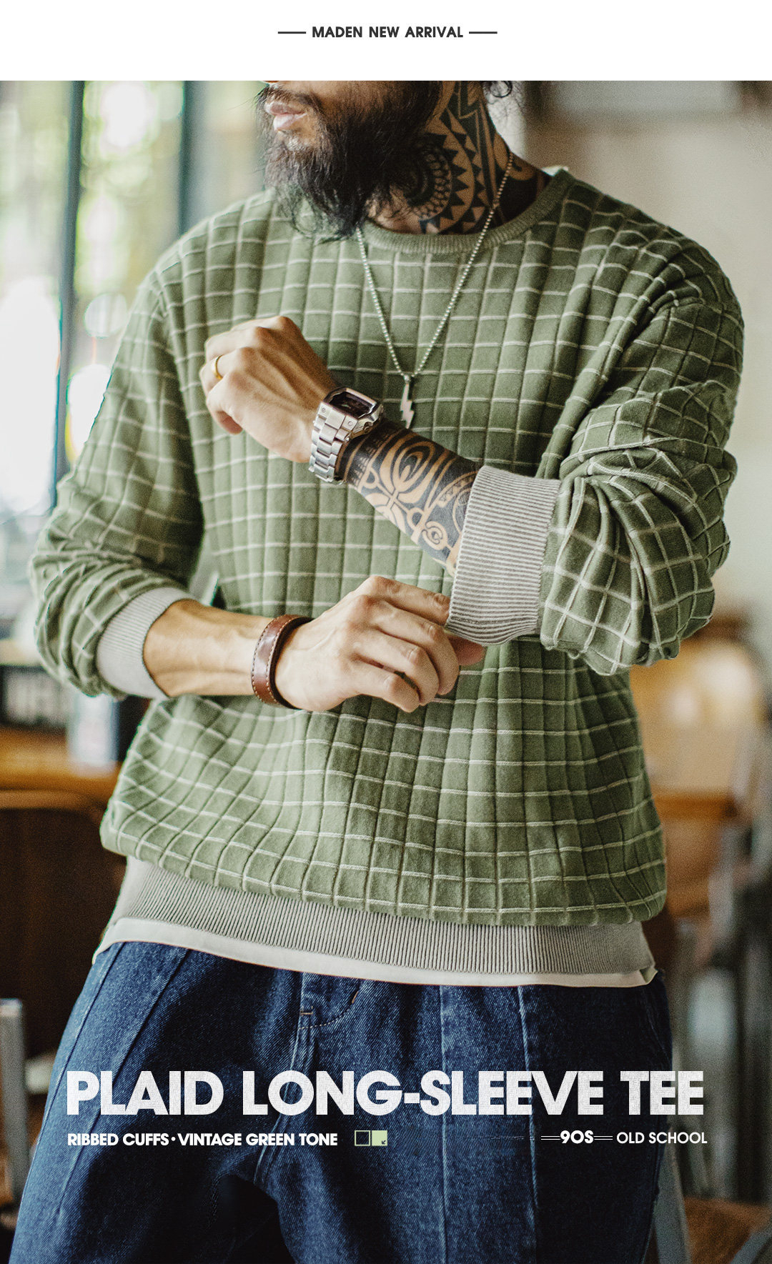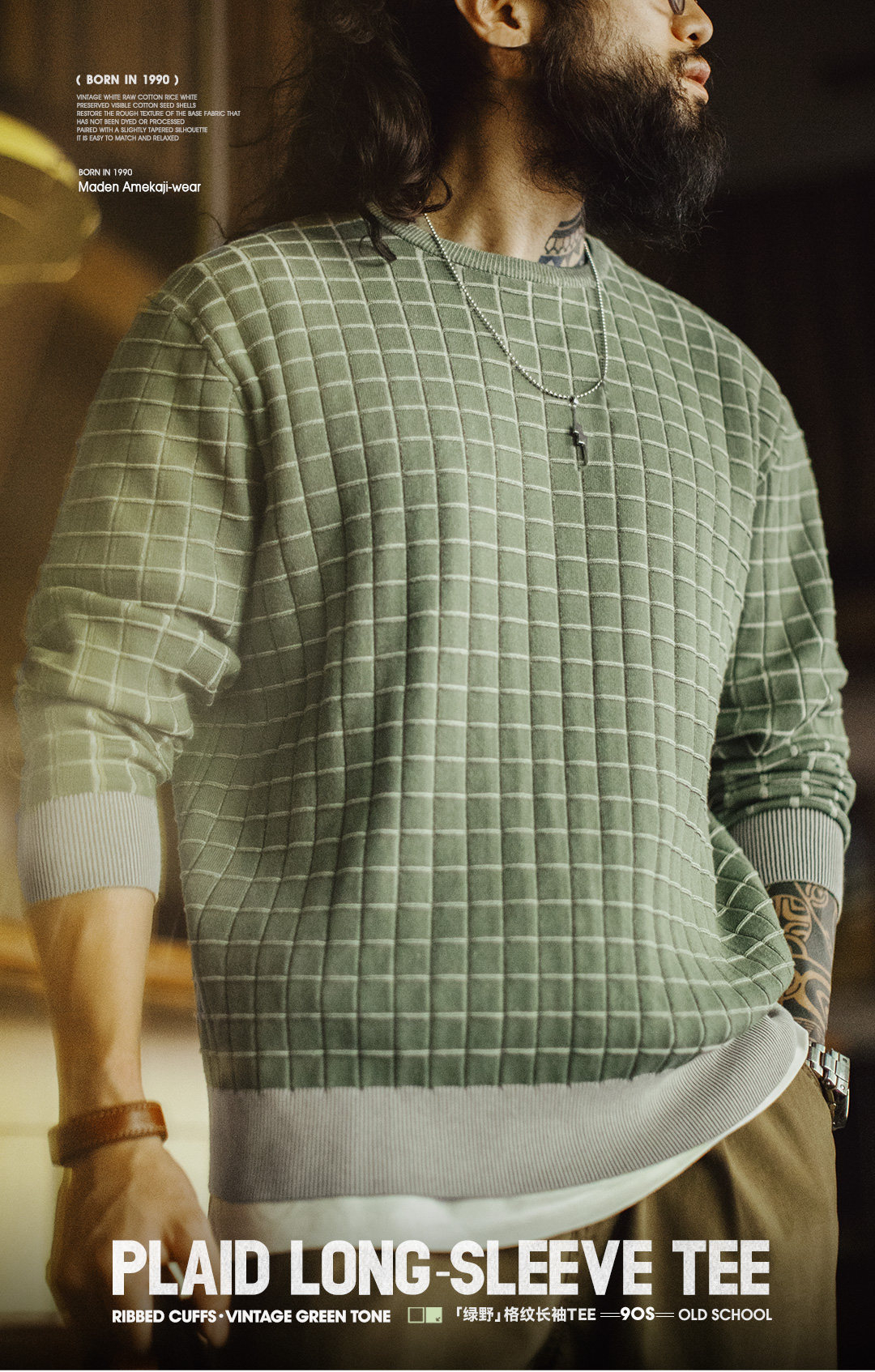 American Retro Plaid Round Neck Sweatshirt With Plaid Green Long Sleeved T-Shirt