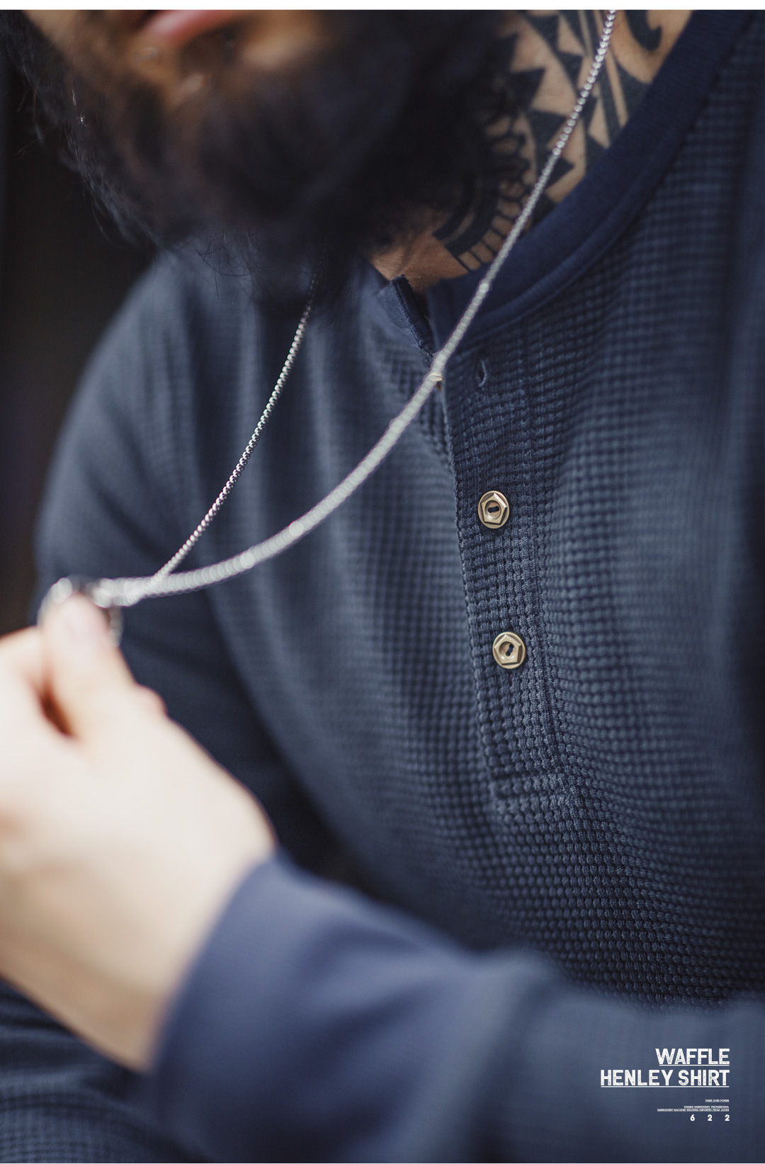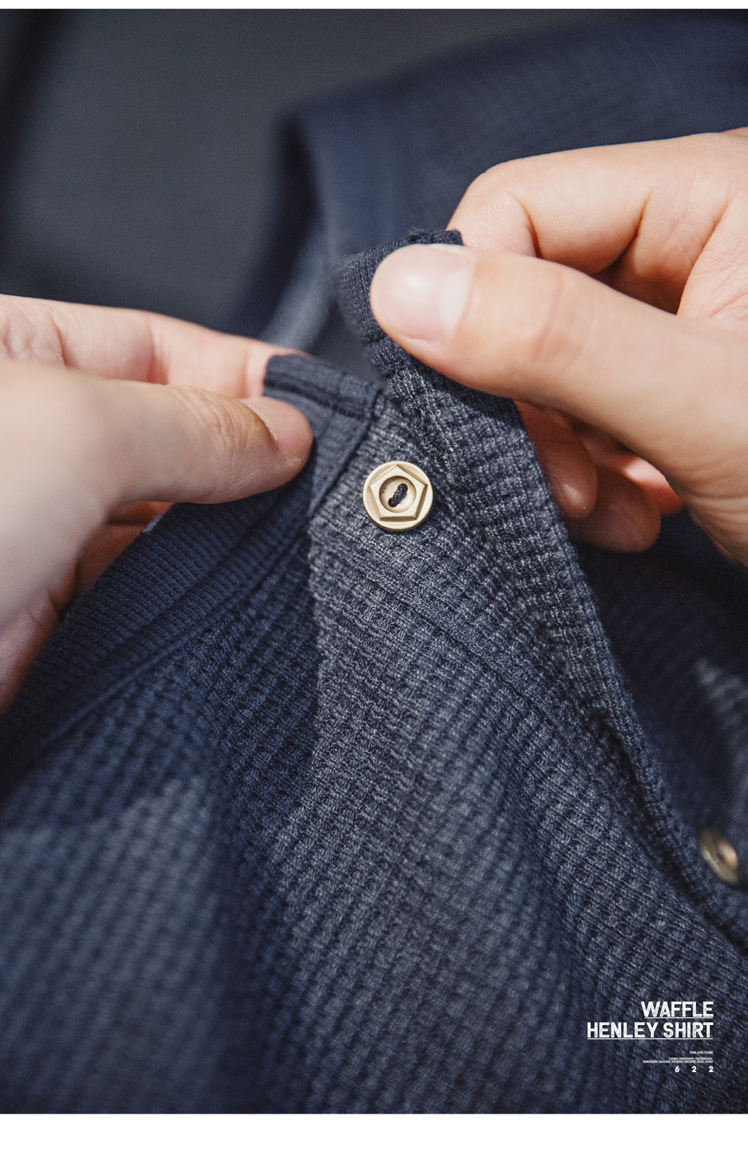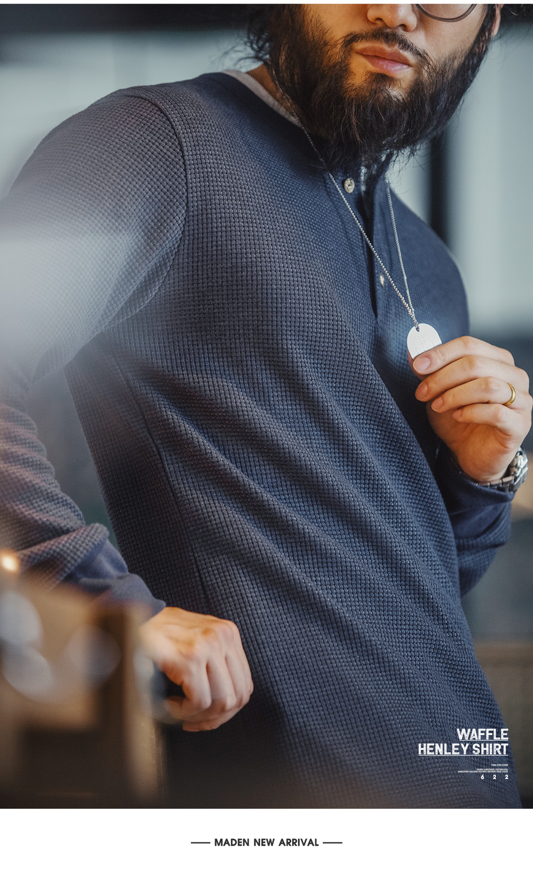 Retro Waffle Knitted Henley Shirt Slim Fit Amekaji Solid Color Long Sleeve T-shirt