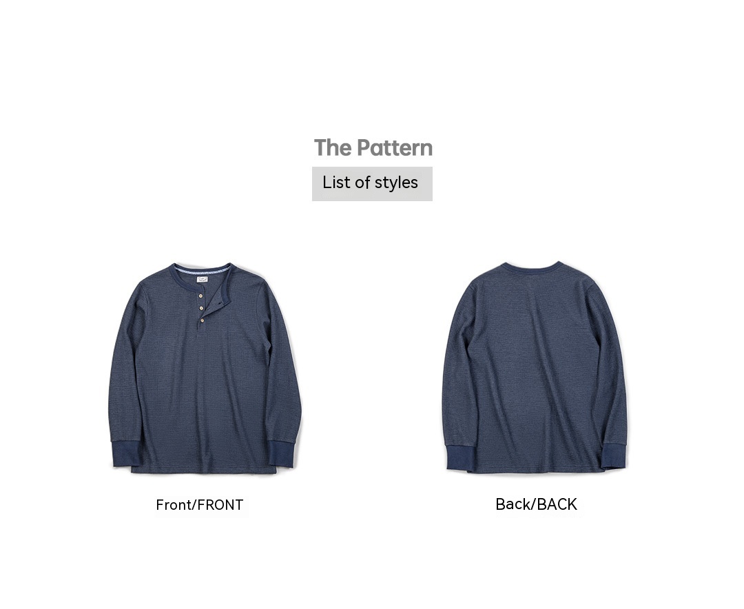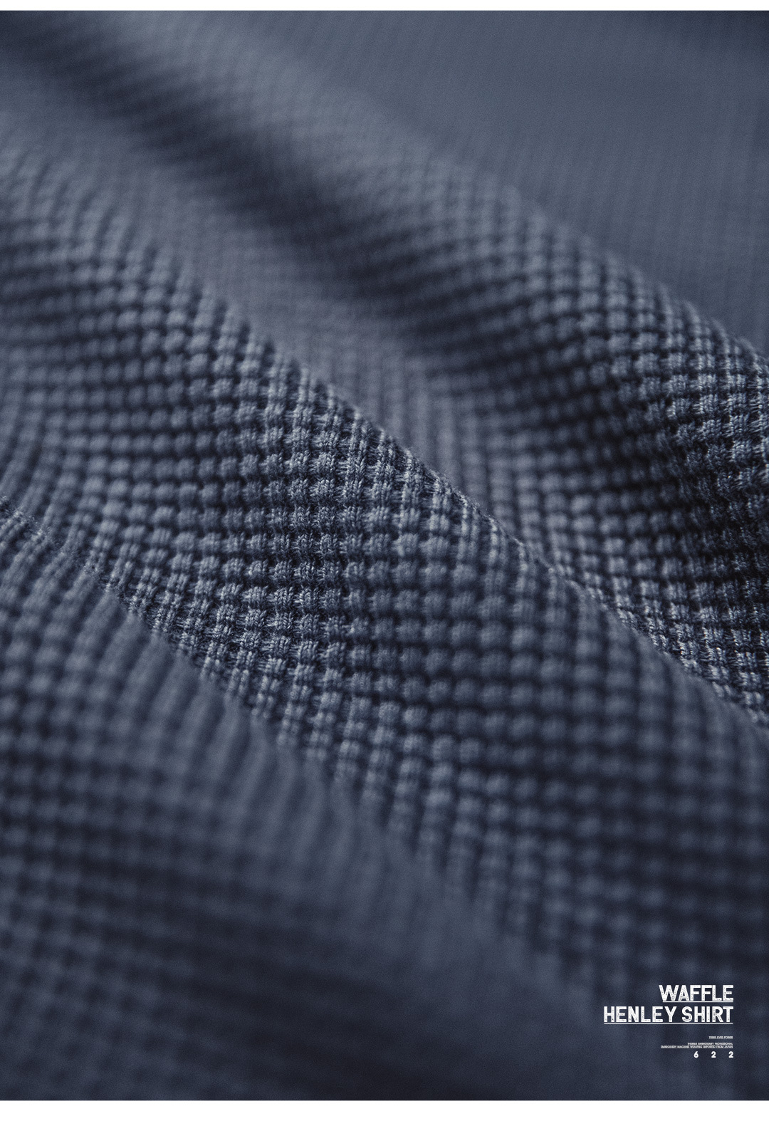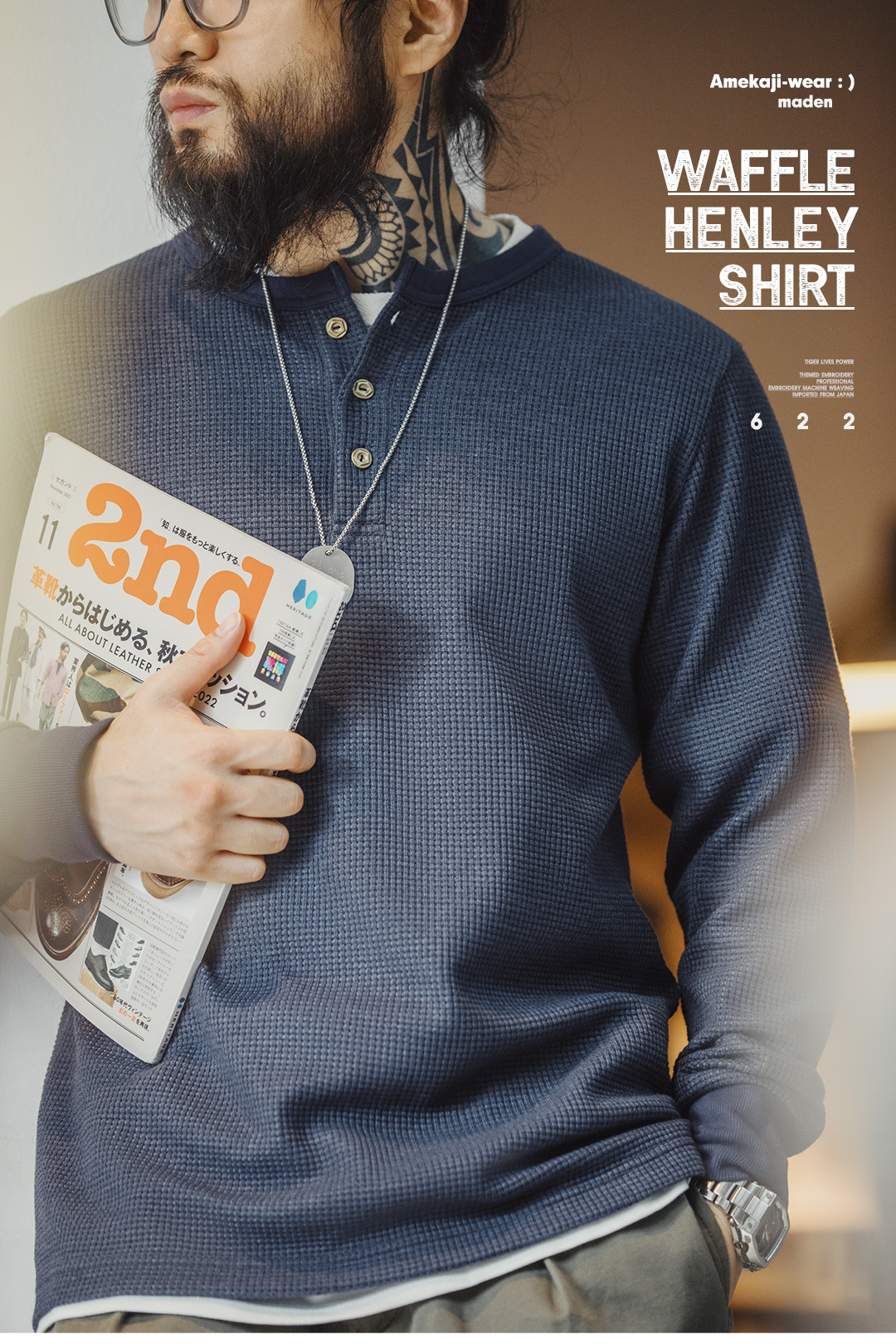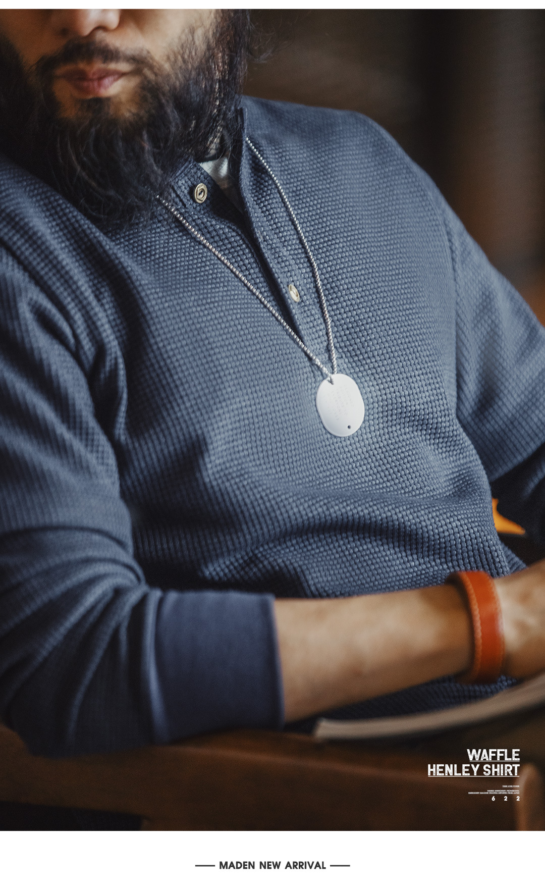 Retro Waffle Knitted Henley Shirt Slim Fit Amekaji Solid Color Long Sleeve T-shirt